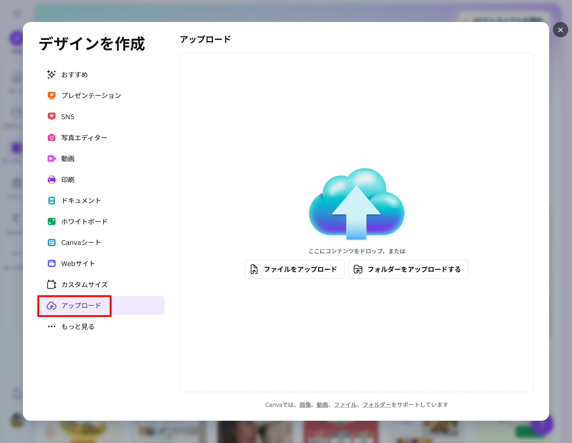 2.「アップロード」 をクリックして、パソコン内の画像を選択(ドラッグ&ドロップでもOK)