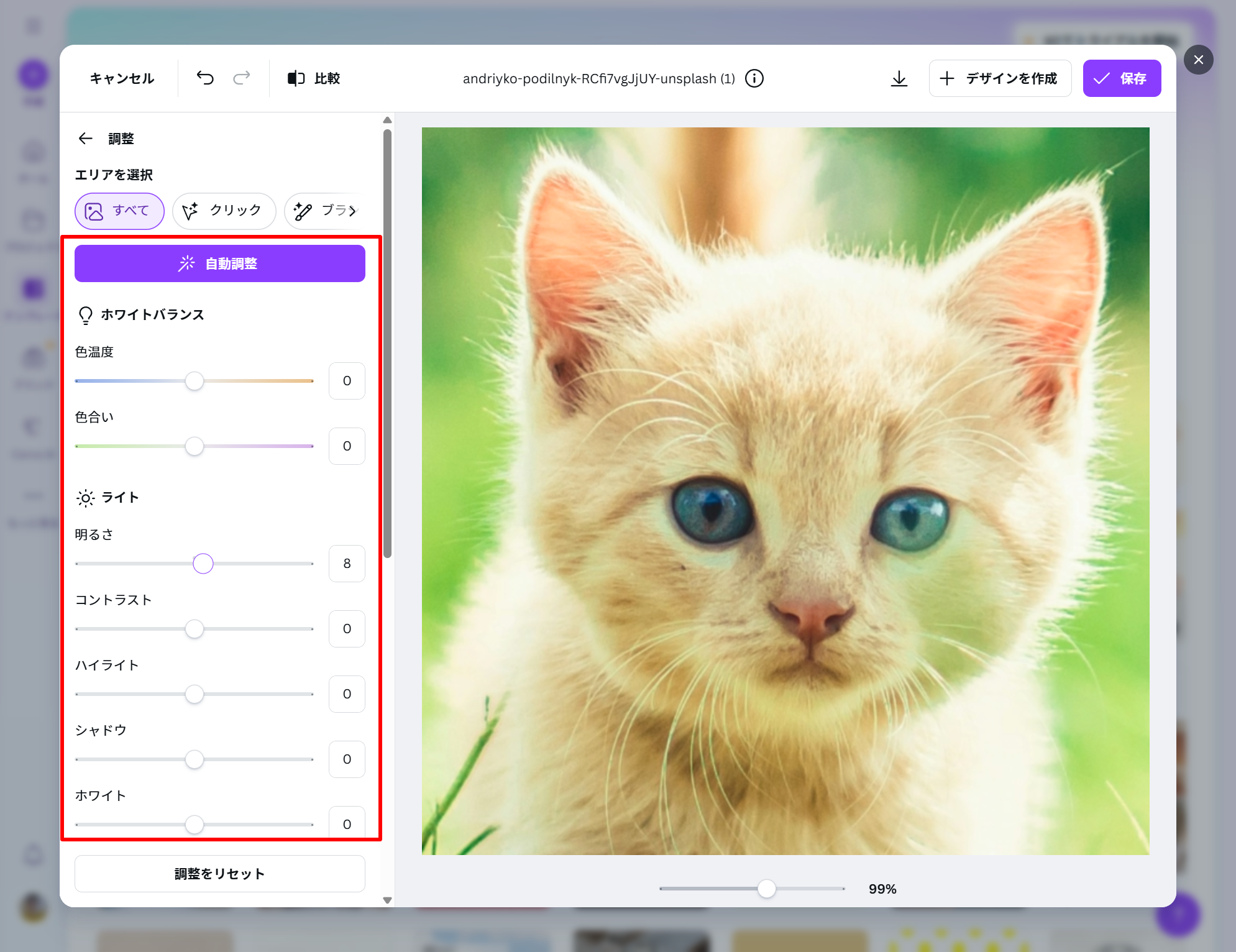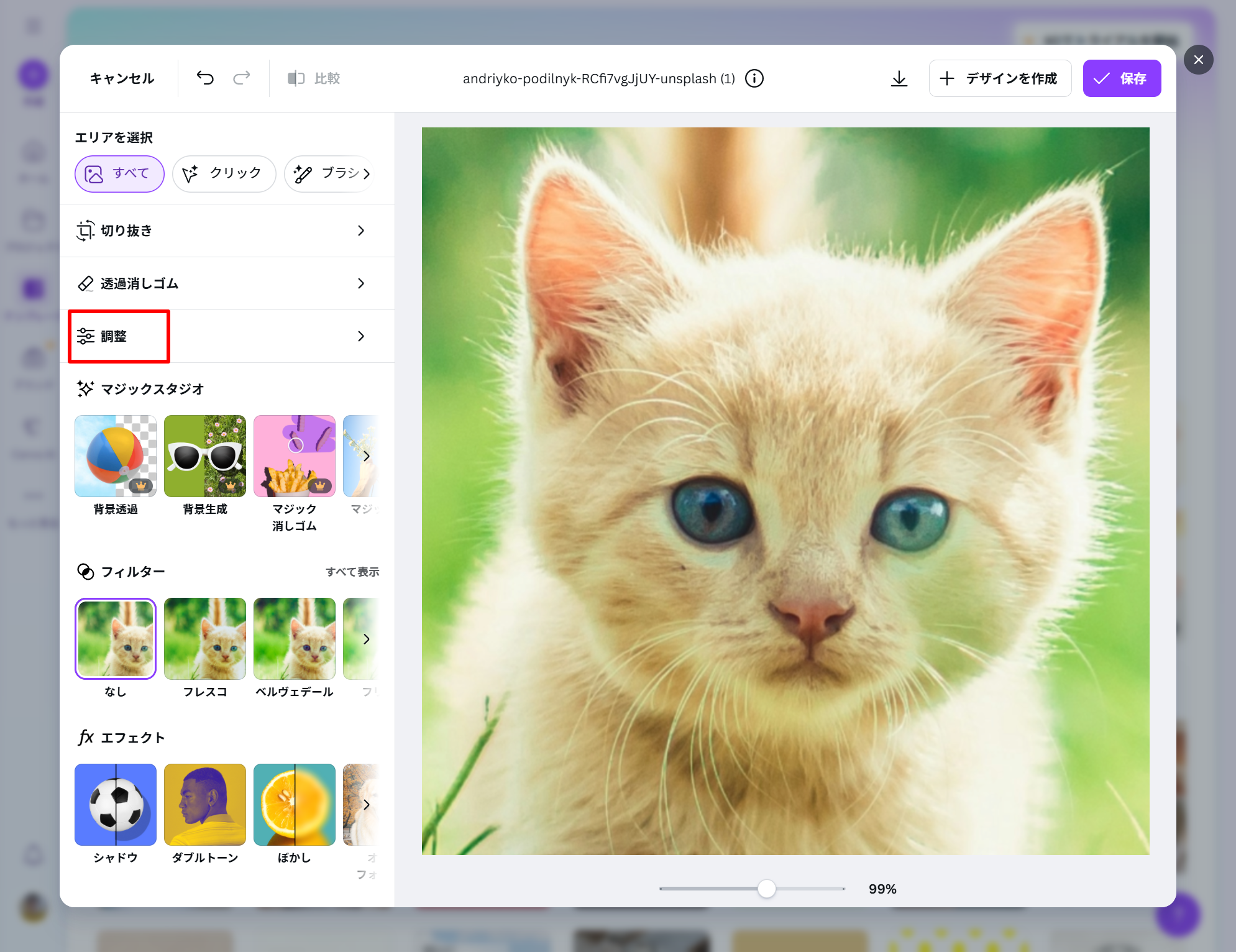 1.左側に表示される 「調整」 をクリック