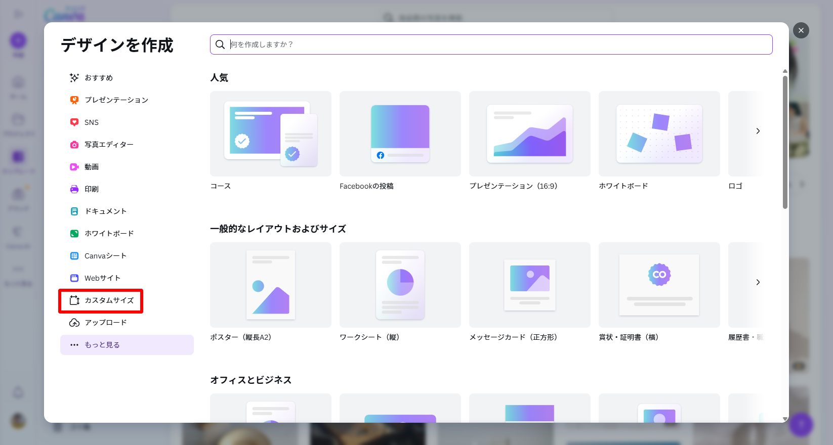 2. 表示されたメニューから 「カスタムサイズ」 をクリックします。