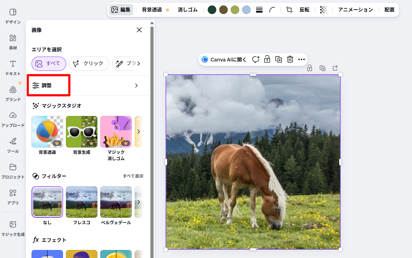 写真の印象を整えたい場合は、Canvaの「調整」機能が便利です。