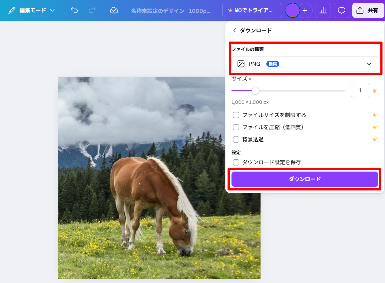 3.ファイルの種類(JPEG/PNGなど)を選択し、「ダウンロード」 をクリックします。